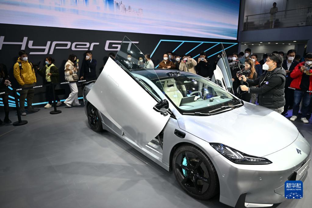 在第二十届广州车展的广汽埃安展台,参观者观看Hyper GT轿跑概念车(2022年12月30日摄)。新华社记者 邓华 摄
