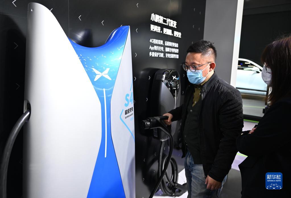 在第二十届广州车展的小鹏汽车展台,参观者体验S4超快充桩(2022年12月30日摄)。新华社记者 邓华 摄