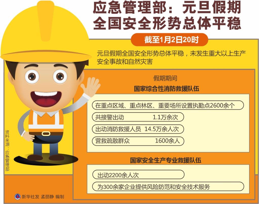 新华社北京1月2日电 记者2日从应急管理部获悉,截至当日20时,元旦假期全国安全形势总体平稳,未发生重大以上生产安全事故和自然灾害。