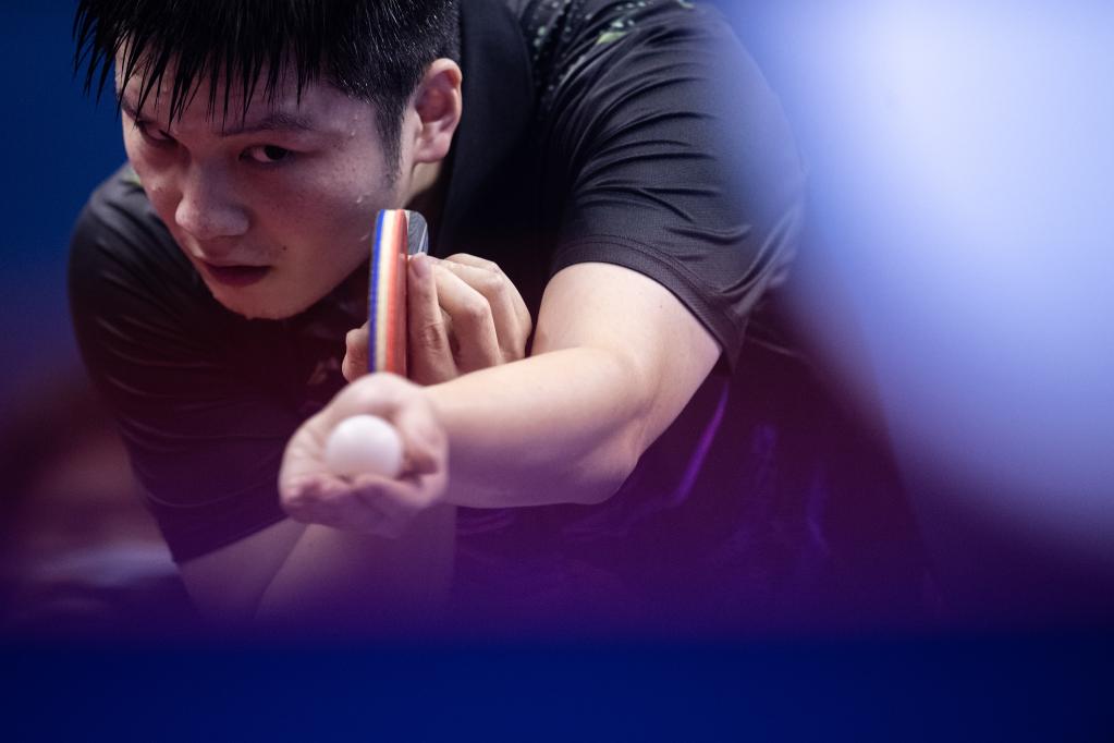 2022年11月12日,在2022全国乒乓球锦标赛男子单打决赛中,上海地产集团队选手樊振东以4:2战胜广东队选手林高远,夺得冠军。图为樊振东在比赛中发球。新华社记者伍志尊摄