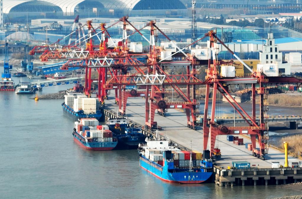 1月3日,在江苏省扬州港集装箱码头,货轮停在泊位上装卸集装箱(无人机照片)。新华社发(孟德龙摄)