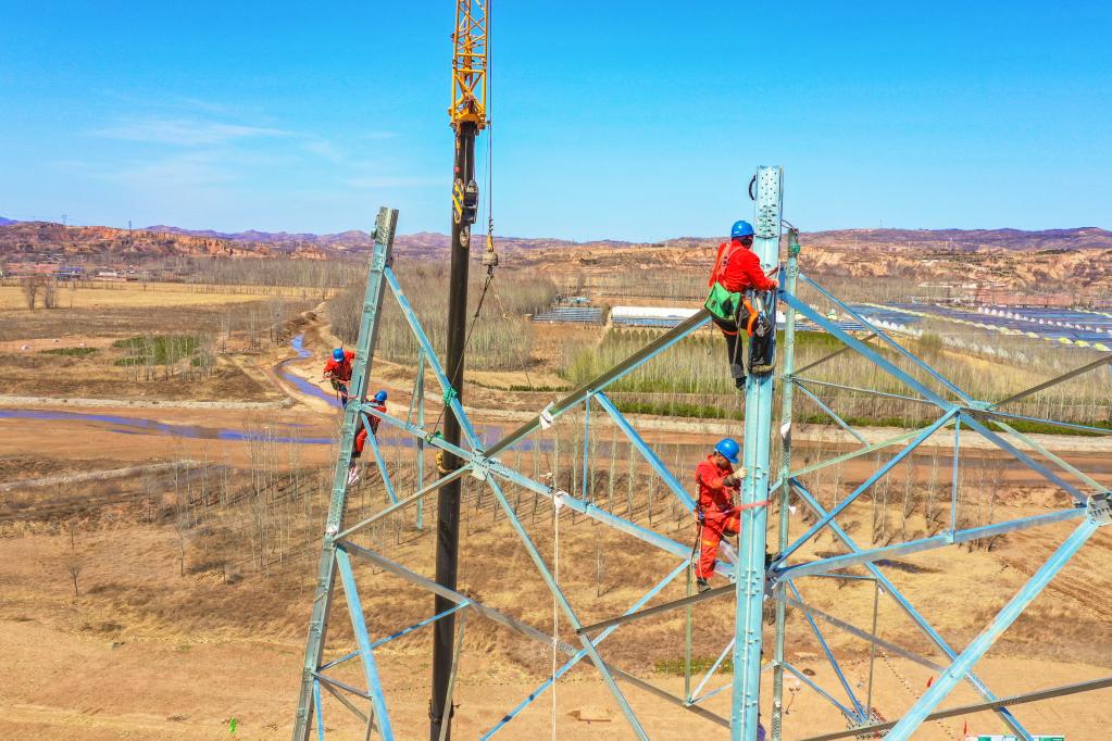在山西,榆社-晋中1000千伏变电站500千伏线路工程现场一派繁忙景象。工人们正在加紧进行铁塔组立作业。作为山西省重点建设项目,工程建成后将进一步提高特高压“两横”通道输电和山西电网整体外送电能力,缓解京津冀负荷中心用电紧张局面。工程计划于2023年6月投产,目前已完成总进度的88.5%。全体参建人员正开足马力奋力攻坚任务节点,全力保障工程按计划推进。