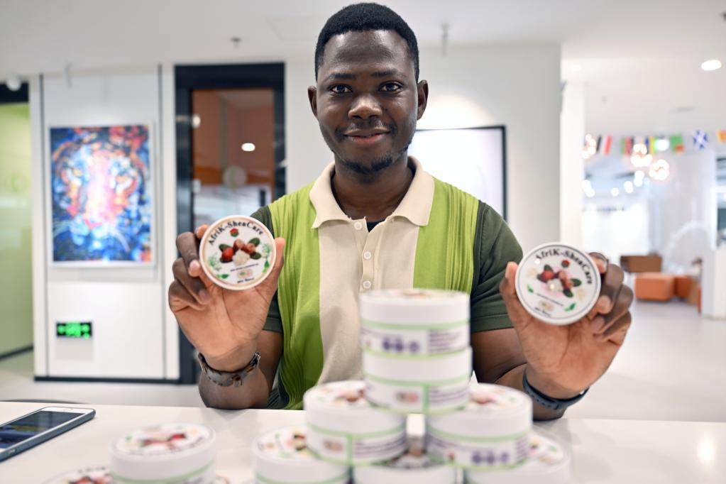 来自加纳的金斯福·约翰在海口展示其公司进口的乳木果油等非洲产品。新华社记者郭程摄