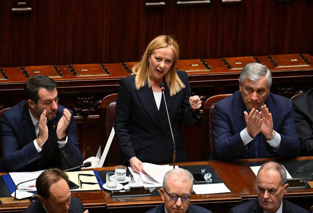 图为2022年10月25日,意大利总理梅洛尼(中)在位于罗马的众议院发表讲话。新华社发(阿尔贝托·林格利亚摄)