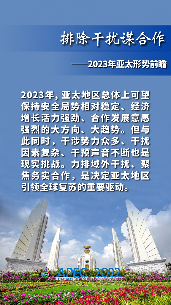 跨进2023年, 亚太地区总体上可望保持安全局势相对稳定、经济增长活力强劲、合作发展意愿强烈的大方向、大趋势。与此同时,干涉势力众多、干扰因素复杂、干预声音不断也将是现实挑战。