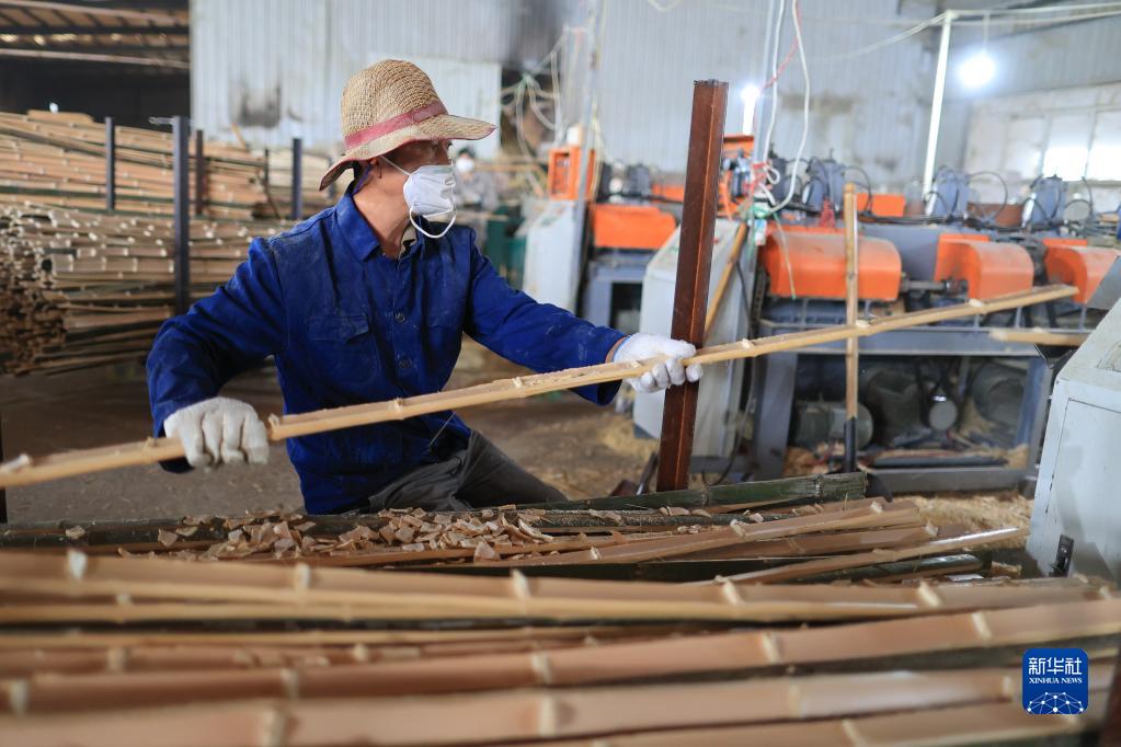 2022年11月30日,工人在贵州新锦竹木制品有限公司内生产竹制品。新华社记者 刘续 摄