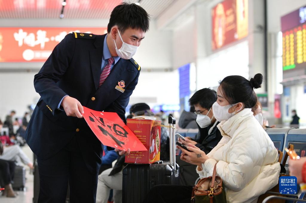 1月6日,在常州站候车室,工作人员向候车旅客送上福字和新春祝福。新华社发(史康 摄)