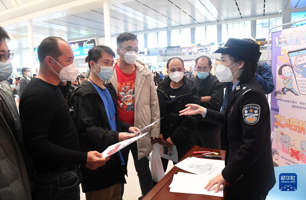 1月6日,一名民警在南宁东站向旅客赠送漫画,宣传安全出行。新华社记者 陆波岸 摄