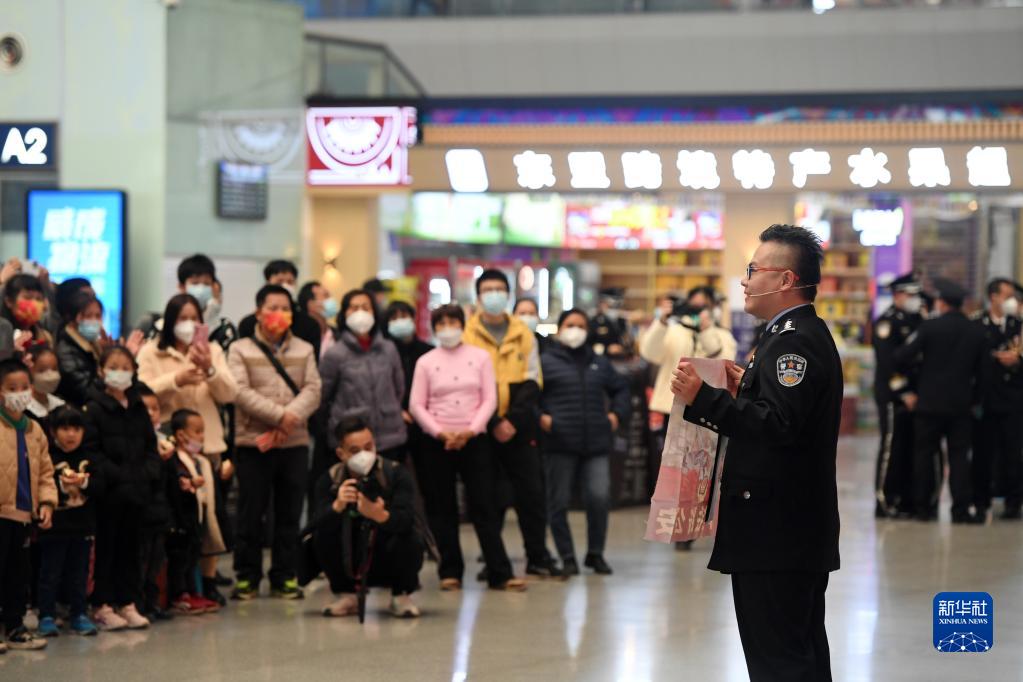 1月6日,一名民警在南宁东站表演魔术,向旅客进行安全宣传。新华社记者 陆波岸 摄