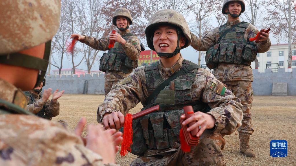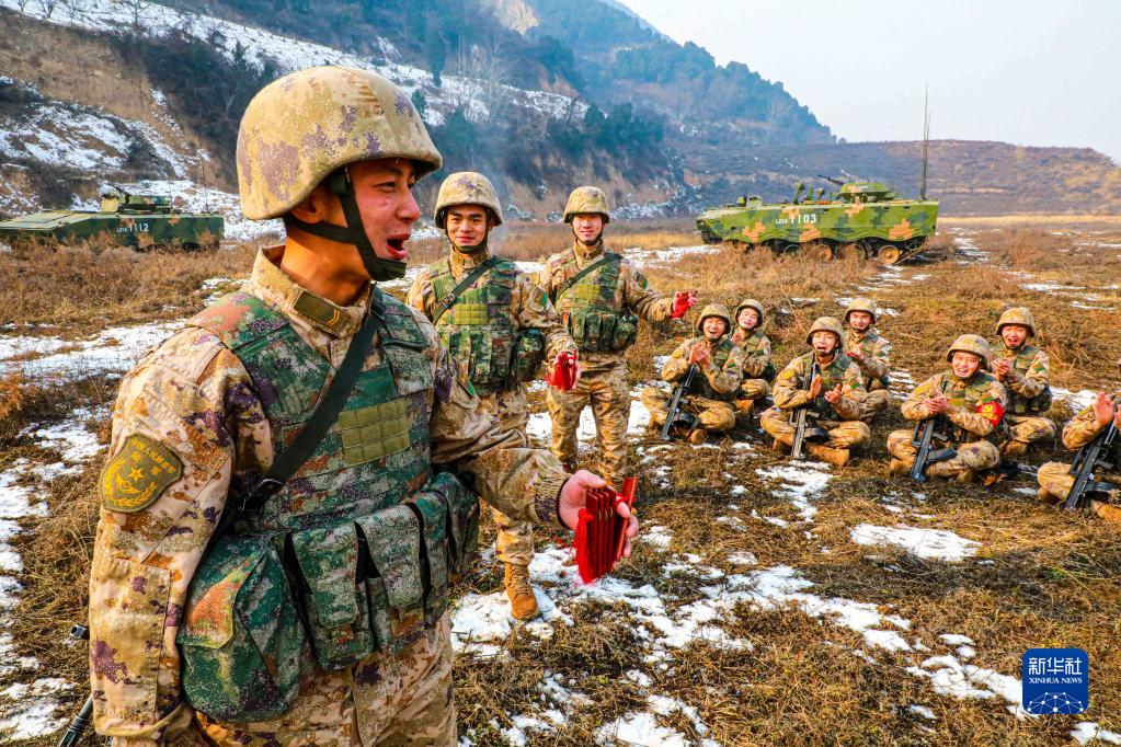 第83集团军某旅“红星快板宣传队”成员和基层官兵进行互动(2023年1月5日摄)。新华社发(张嘉成 摄)