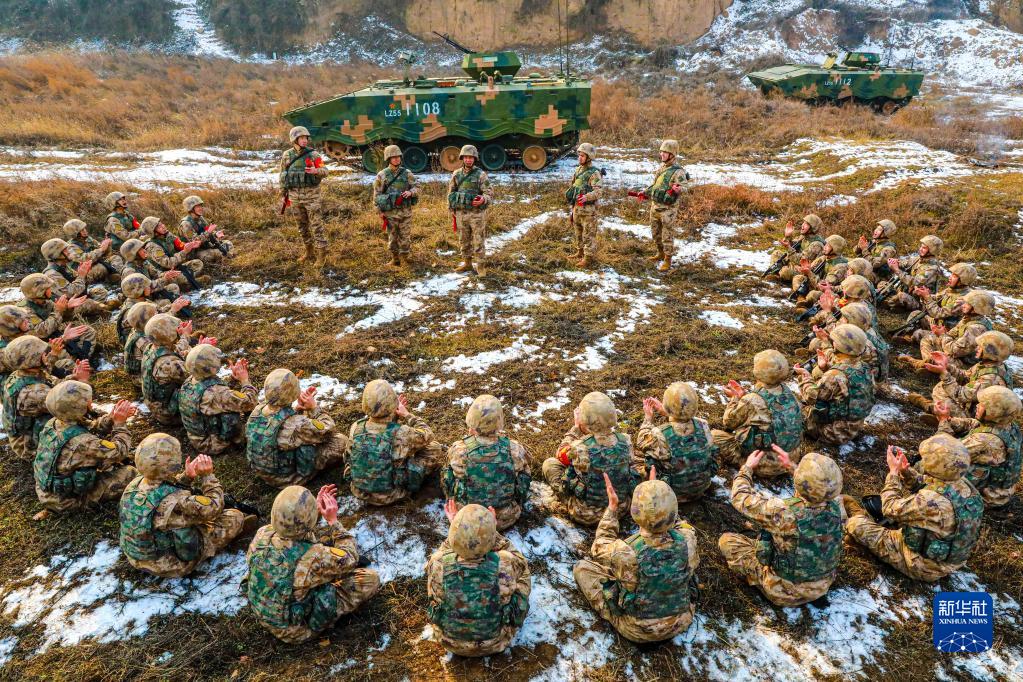 在第83集团军某旅训练场,“红星快板宣传队”成员用自创编排的快板节目为基层官兵宣传党的二十大精神(2022年12月31日摄)。新华社发(张嘉成 摄)