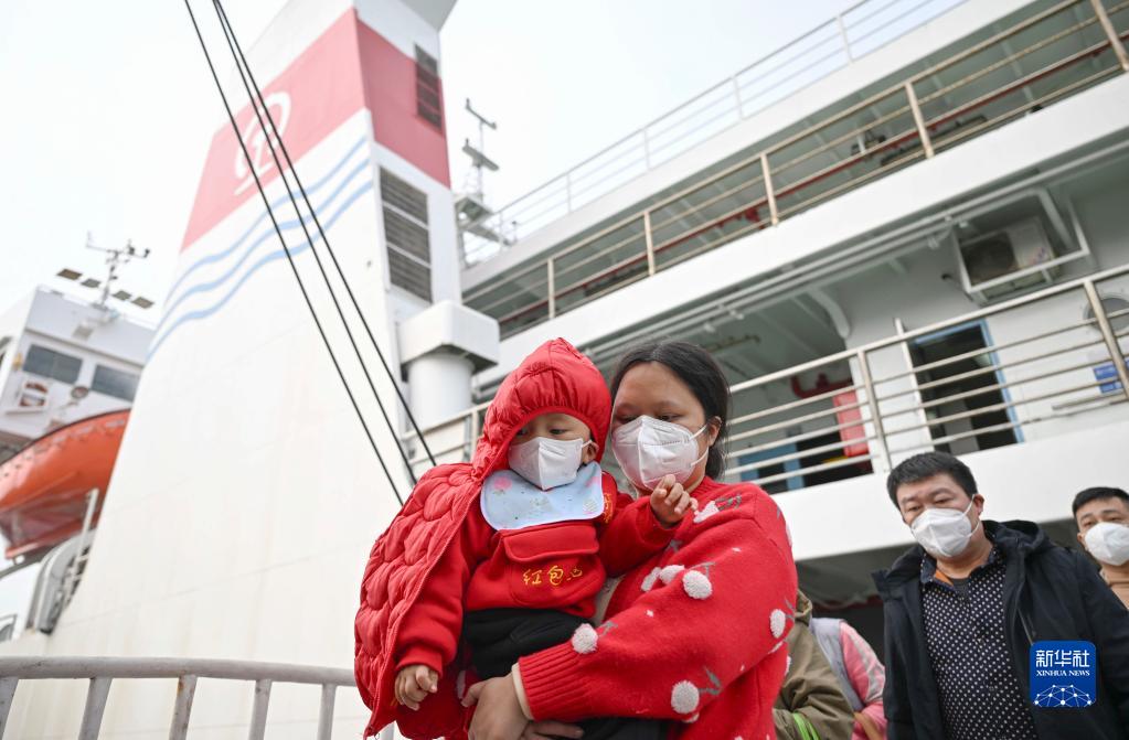 1月7日,在广东徐闻的粤海铁路轮渡北港码头,粤海铁1号轮渡上的旅客陆续下船。