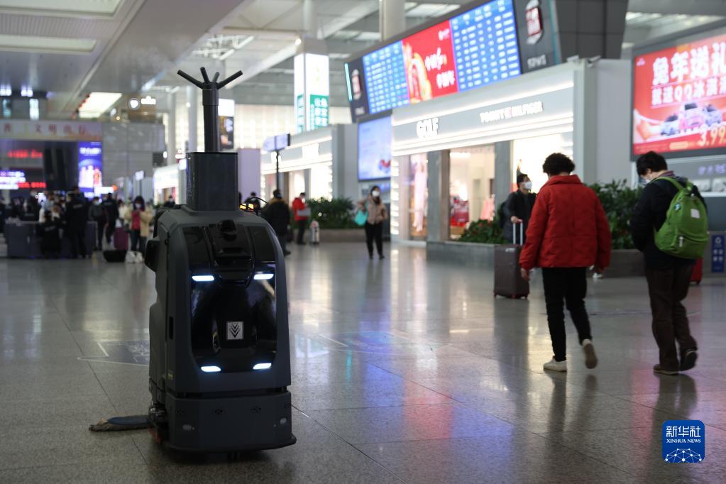 1月7日,集消毒、保洁于一体的清扫机器人在上海虹桥火车站进行自动化消毒作业。