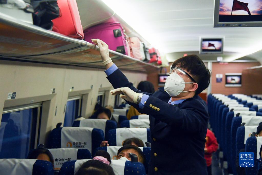 1月7日,在北京西站,列车乘务员在发车前检查车厢行李放置情况。