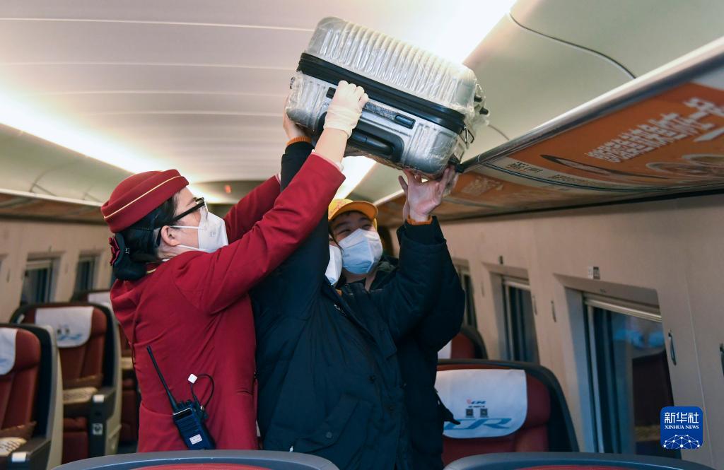 1月7日,在北京西站,列车乘务员在发车前帮旅客放置行李。