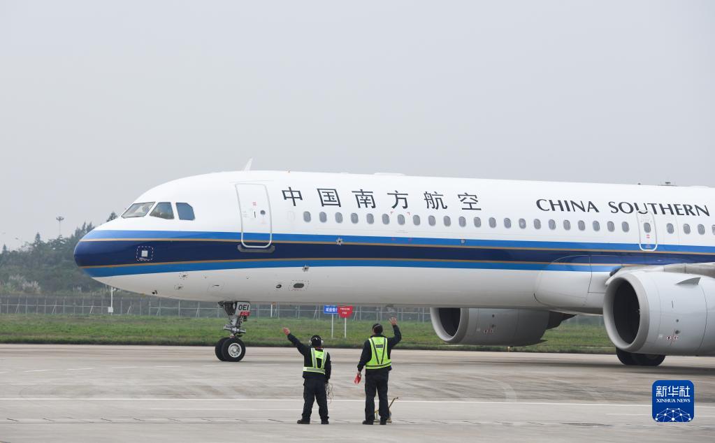 1月7日,在海口美兰国际机场,工作人员挥手送别即将起飞的飞机。