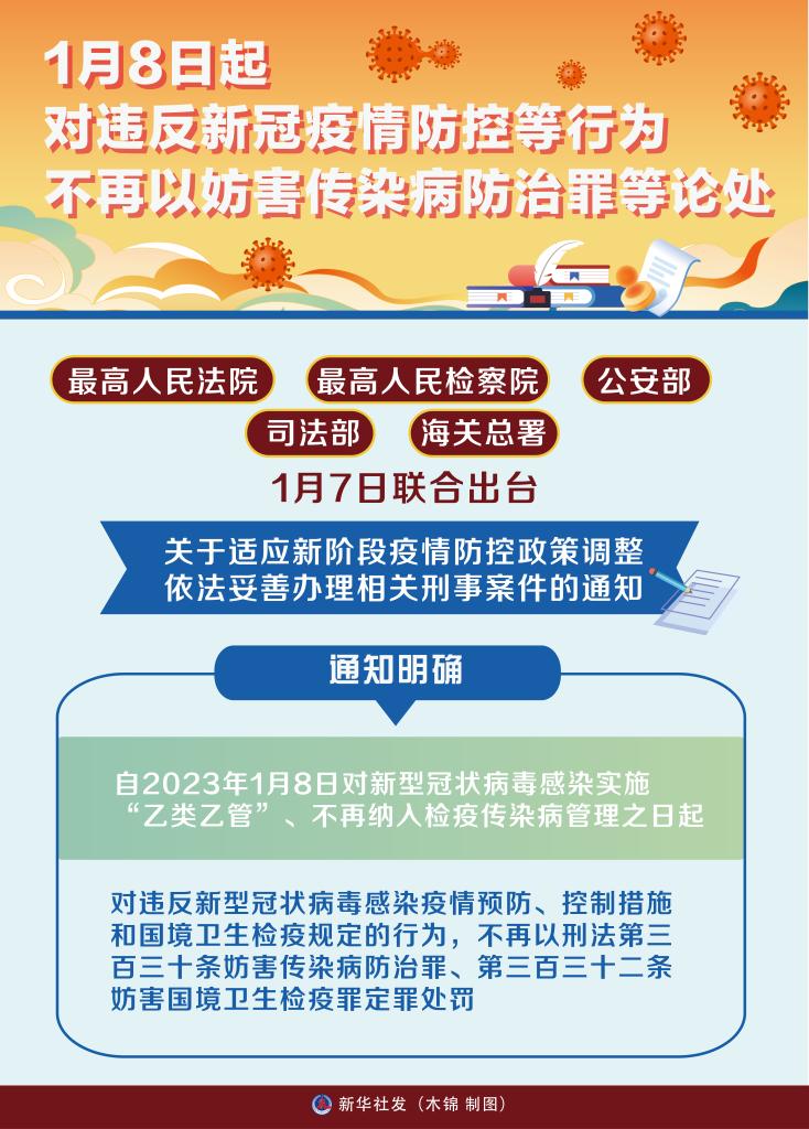 通知明确,自2023年1月8日对新型冠状病毒感染实施“乙类乙管”、不再纳入检疫传染病管理之日起,对违反新型冠状病毒感染疫情预防、控制措施和国境卫生检疫规定的行为,不再以刑法第三百三十条妨害传染病防治罪、第三百三十二条妨害国境卫生检疫罪定罪处罚。