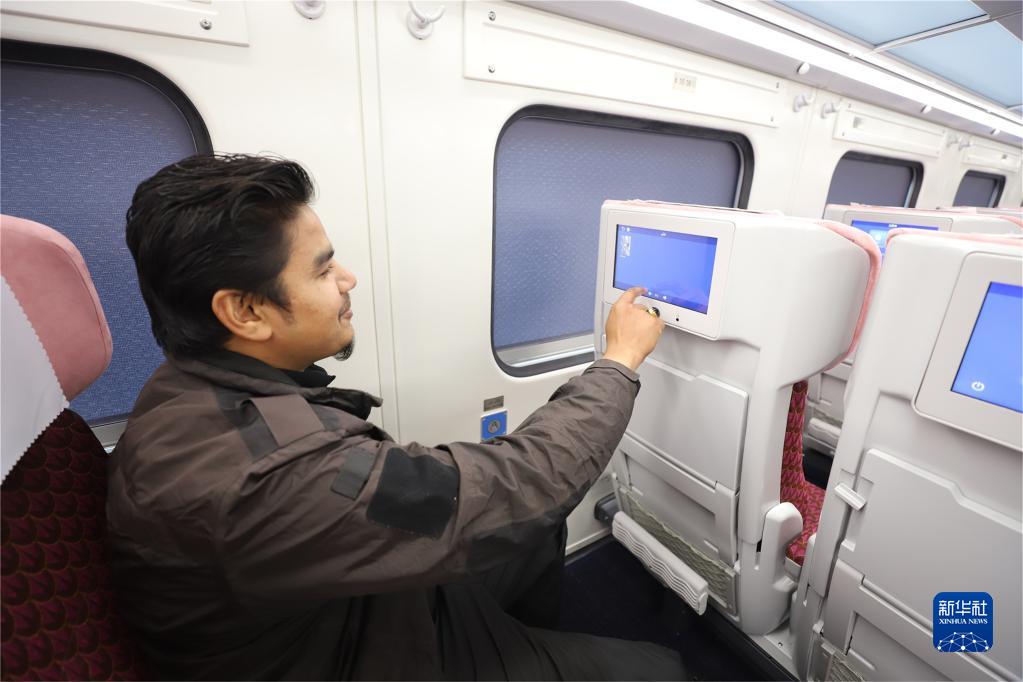 1月5日,在位于巴基斯坦拉合尔的从中国进口的宽轨客车里,巴基斯坦铁路公司的技术人员测试视听娱乐设备。新华社记者 蒋超 摄