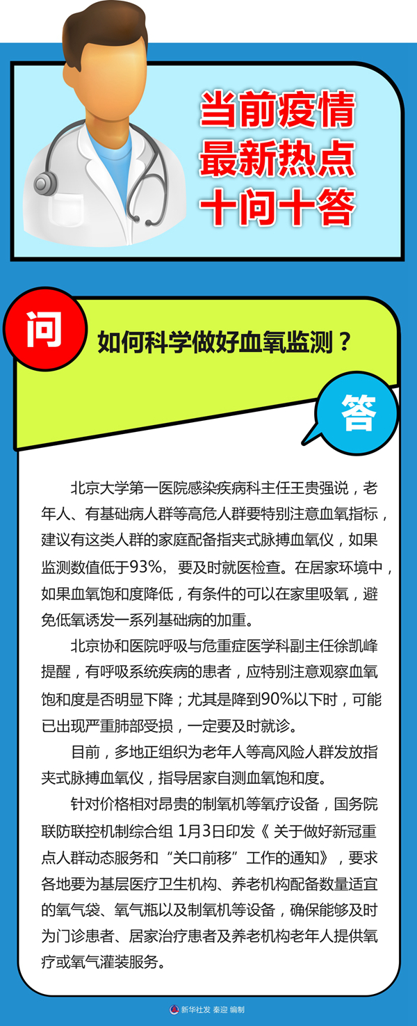 王贵强说,老年人、有基础病人群等高危人群要特别注意血氧指标,建议有这类人群的家庭配备指夹式脉搏血氧仪,如果监测数值低于93%,要及时就医检查。在居家环境中,如果血氧饱和度降低,有条件的可以在家里吸氧,避免低氧诱发一系列基础病的加重。