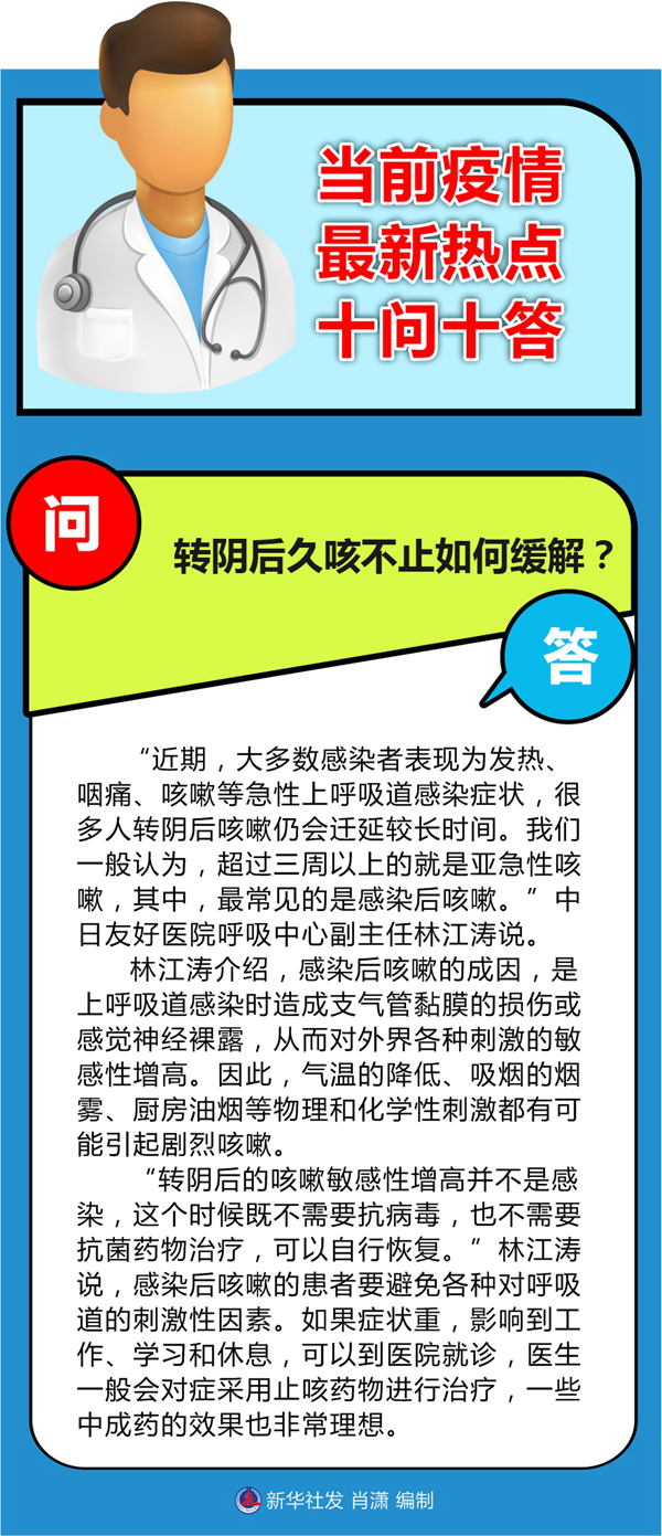 “转阴后的咳嗽敏感性增高并不是感染,这个时候既不需要抗病毒,也不需要抗菌药物治疗,可以自行恢复。”林江涛说,感染后咳嗽的患者要避免各种对呼吸道的刺激性因素。如果症状重,影响到工作、学习和休息,可以到医院就诊,医生一般会对症采用止咳药物进行治疗,一些中成药的效果也非常理想。