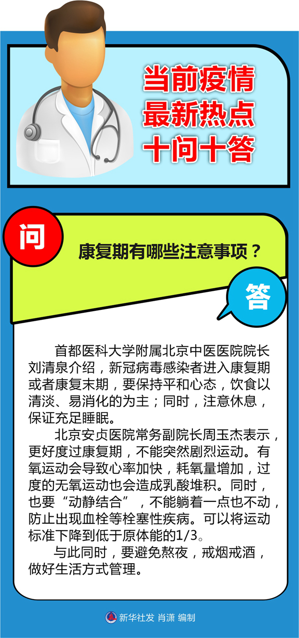 首都医科大学附属北京中医医院院长刘清泉介绍,新冠病毒感染者进入康复期或者康复末期,要保持平和心态,饮食以清淡、易消化的为主;同时,注意休息,保证充足睡眠。