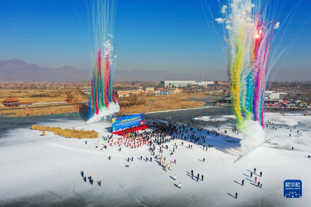 这是土默特左旗哈素海首届冬捕节的活动现场(1月9日摄,无人机照片)。
