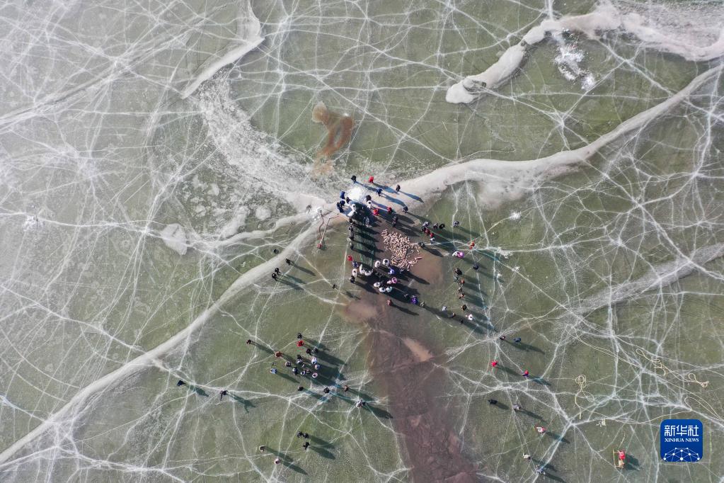 这是土默特左旗哈素海的冬捕现场(1月9日摄,无人机照片)。