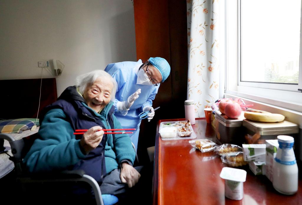 1月7日,在上海中福会养老院,一名老人在工作人员帮助下吃饭。新华社记者 方喆 摄