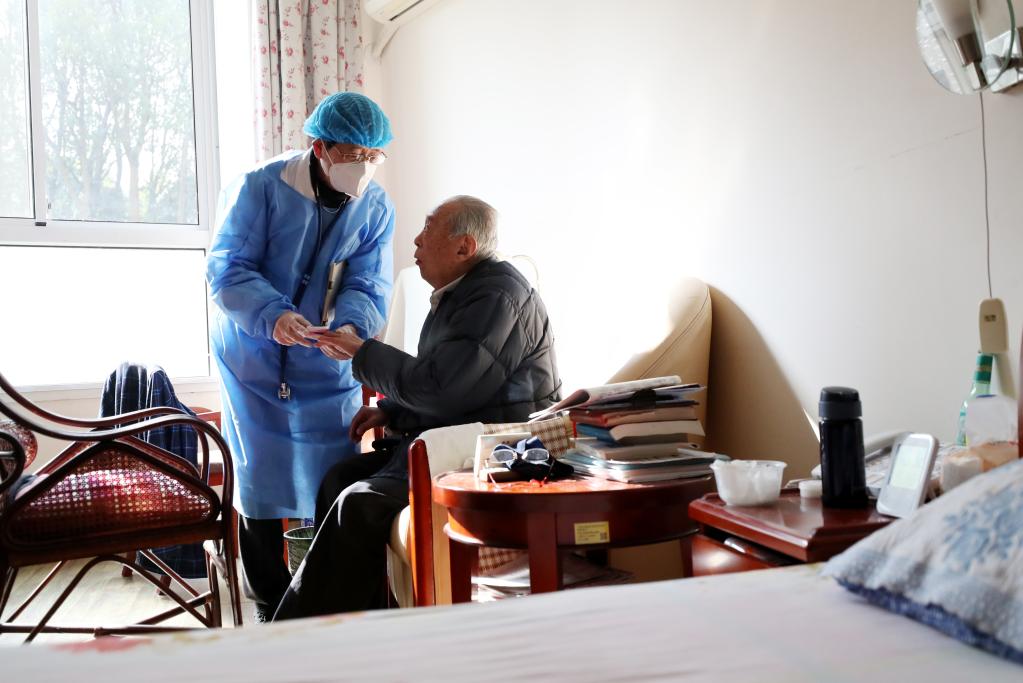 1月7日,在上海中福会养老院,驻院医生彭俊(左)给老人做血氧监测。新华社记者 方喆 摄