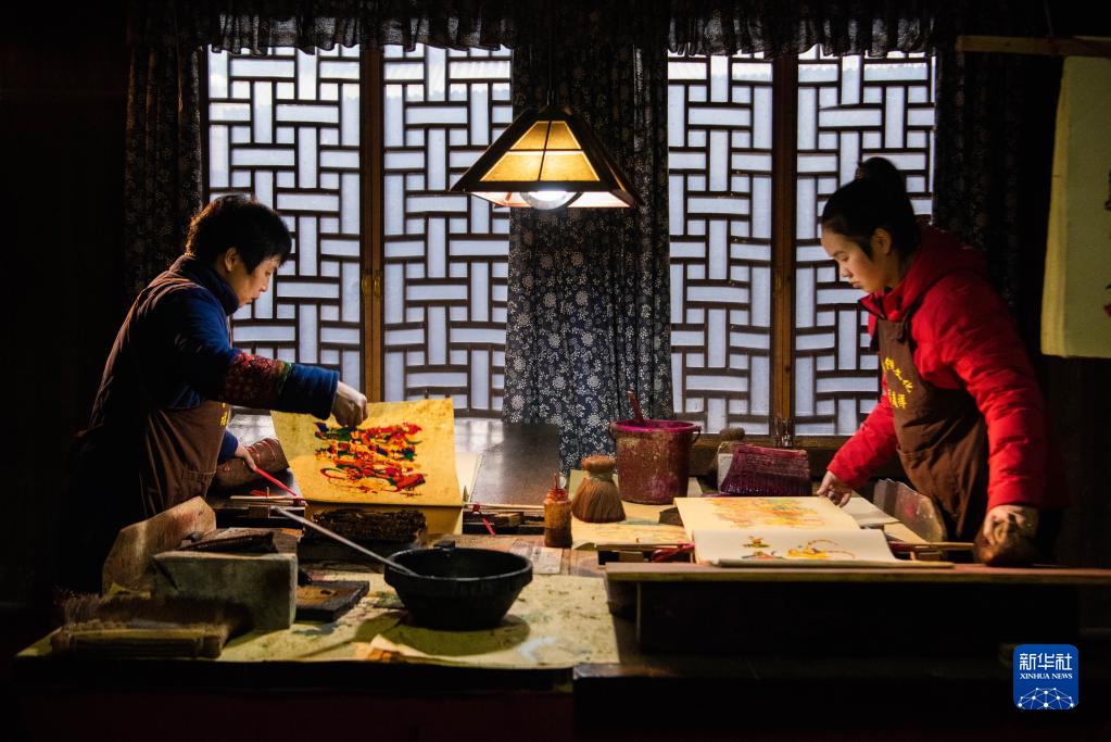 2022年1月21日,在湖南省邵阳市隆回县滩头镇一家年画作坊,年画艺人尹冬香(左)和女儿肖扬在印制年画。