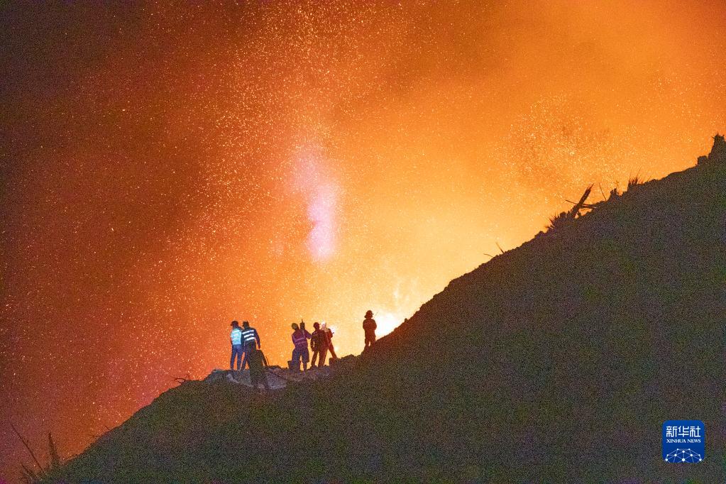 2022年8月25日晚,在重庆市北碚区缙云山,现场救援人员在火场一线灭火。截至8月26日8时30分,经各方共同努力,重庆市森林火灾各处明火已全部扑灭,全面转入清理看守阶段,无人员伤亡和重要设施损失。