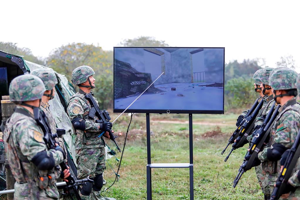 第71集团军“临汾旅”官兵使用城市作战仿真系统进行训练(2022年11月19日摄)。新华社发(何丹 摄)
