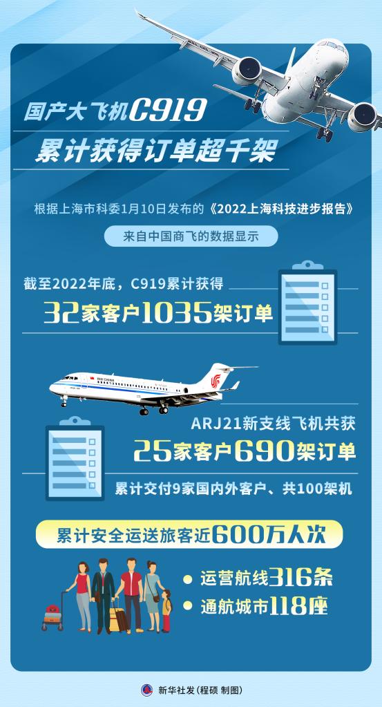 根据上海市科委1月10日发布的《2022上海科技进步报告》,来自中国商飞的数据显示,2022年12月,C919大型客机首架机交付首家用户东方航空公司,迈出市场运营“第一步”。截至2022年底,C919累计获得32家客户1035架订单。