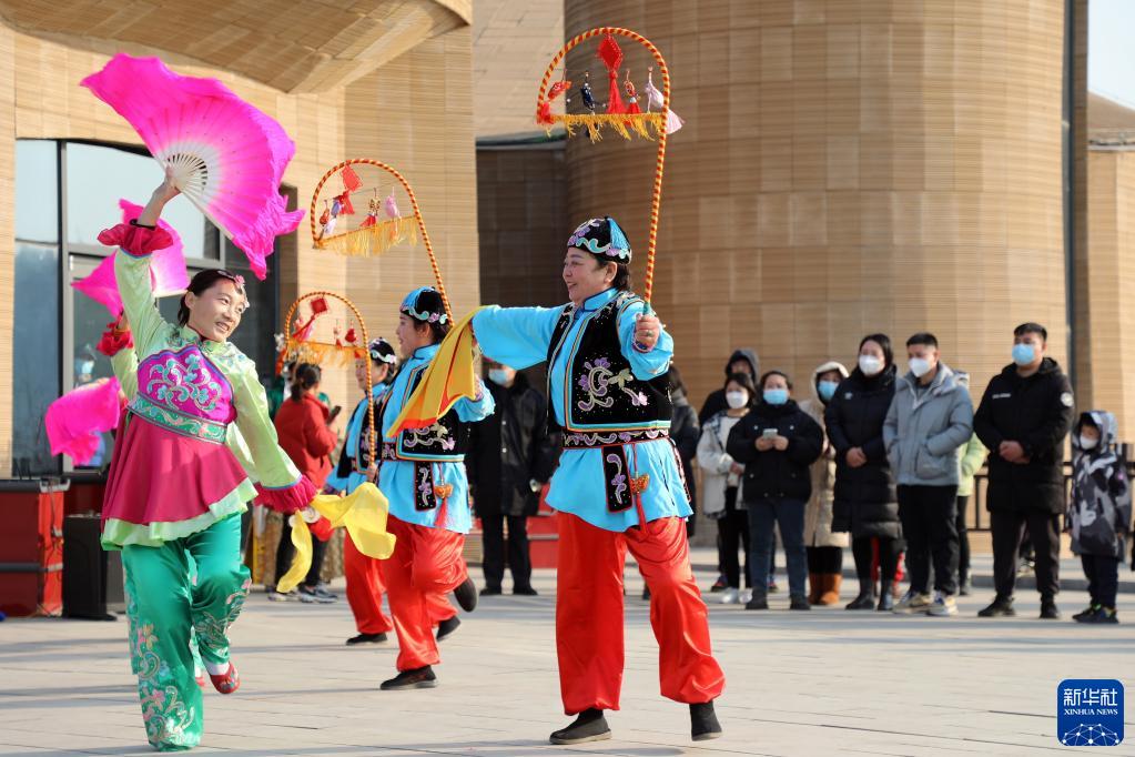 1月10日,石家庄市井陉县庄旺拉花队演员在井陉县南横口村表演井陉拉花。