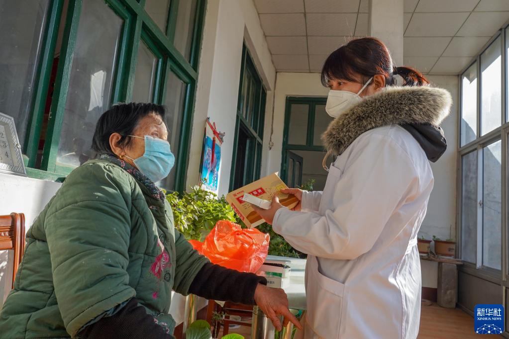 1月10日,山东省济南市长清区大崮山村卫生室全科医生王玉新上门为76岁的王好美老人发放药品。