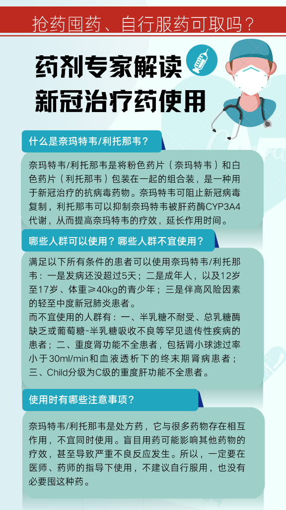 陆军军医大学陆军特色医学中心药剂科主管药师杨雪表示,奈玛特韦/利托那韦主要是用于降低高危人群在感染新冠后的住院率及发展成为重症的风险,不是用来减轻头疼、发热、咳嗽、喉咙疼等这些症状的药。大家一定要在医师、药师的指导下使用奈玛特韦/利托那韦。不建议自行服用,也没有必要囤这种药。