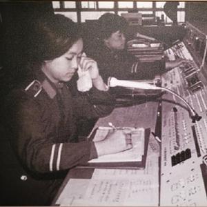 在三楼展厅南墙正中,有一张黑白照片,不少人驻足围观,堪称“镇馆之宝”。照片里,着旧式警服的两位女警坐在一台满是按钮的设备前,一手拿起电话,一手在笔记本上写着什么。