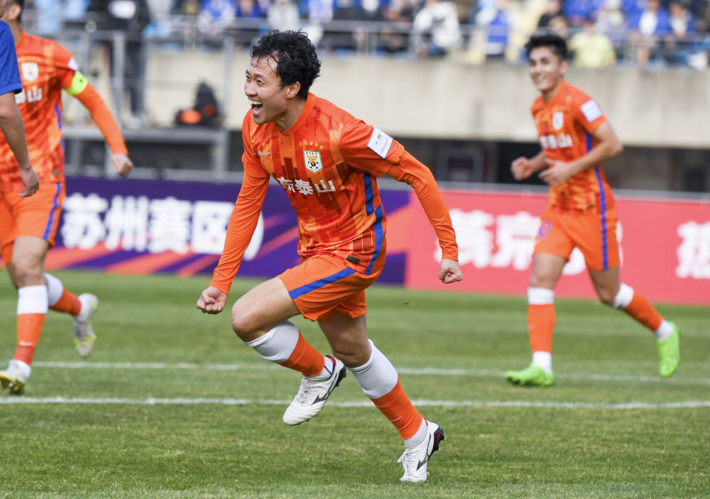 1月11日,山东泰山队球员宋龙庆祝进球。新华社记者李博摄