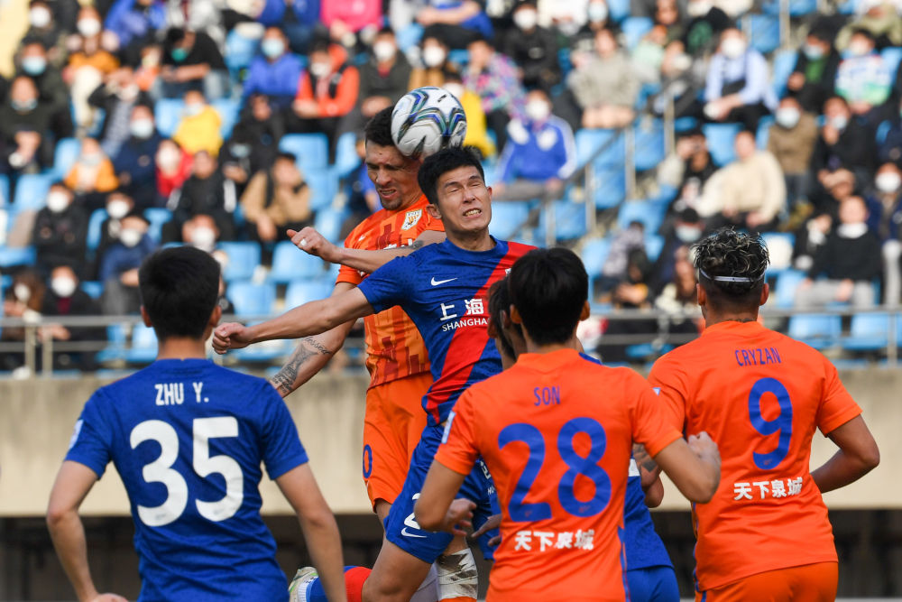 1月11日,山东泰山队球员莫伊塞斯(左二)在比赛中争抢头球。新华社记者李博摄