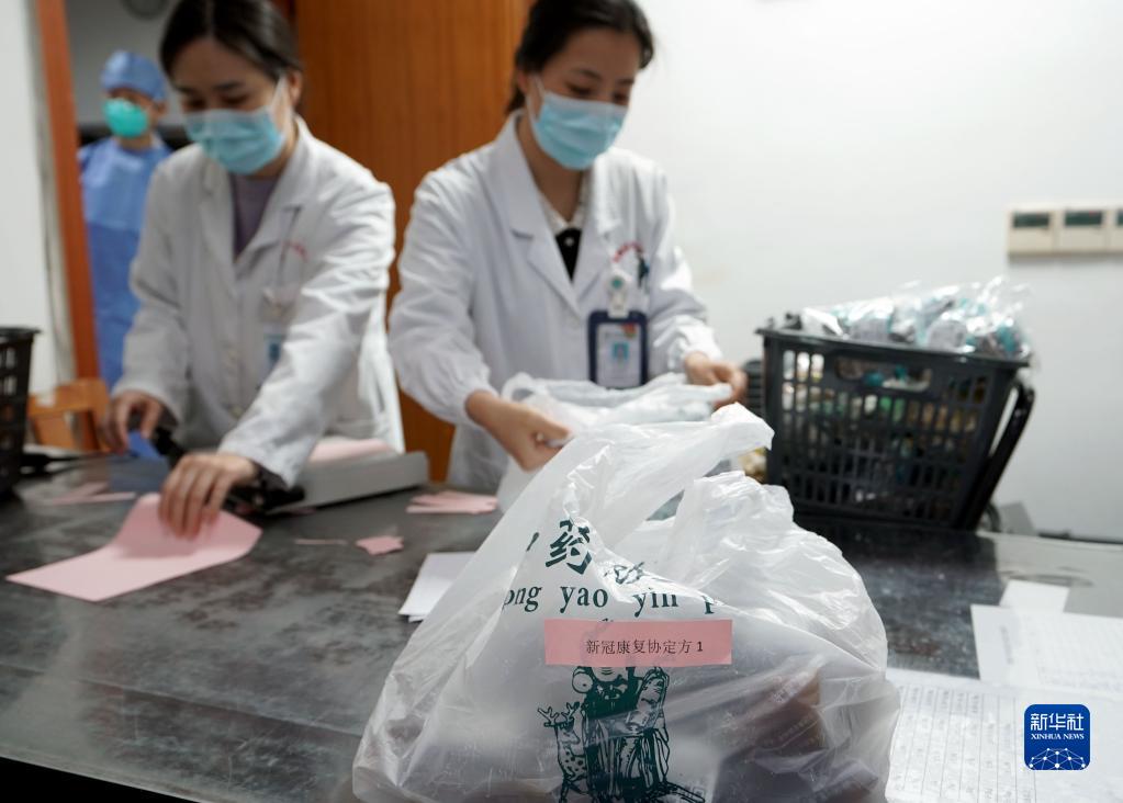 1月10日,在青浦区中医医院药房,中药师打包药品。