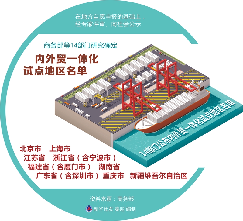 新华社北京1月11日电(记者谢希瑶)记者11日从商务部获悉,在地方自愿申报的基础上,经专家评审、向社会公示,商务部等14部门研究确定了内外贸一体化试点地区名单,包括北京市、上海市、江苏省、浙江省(含宁波市)、福建省(含厦门市)、湖南省、广东省(含深圳市)、重庆市、新疆维吾尔自治区。