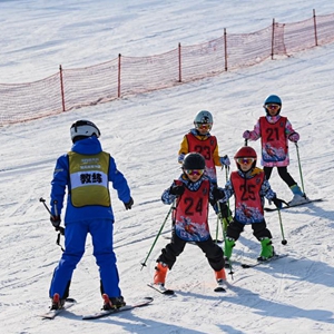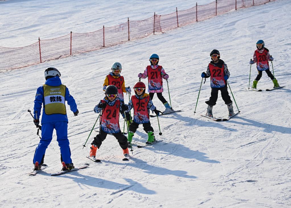 小学员在鳌山滑雪场教练的指导下练习滑雪。新华社发(邹竞一摄)