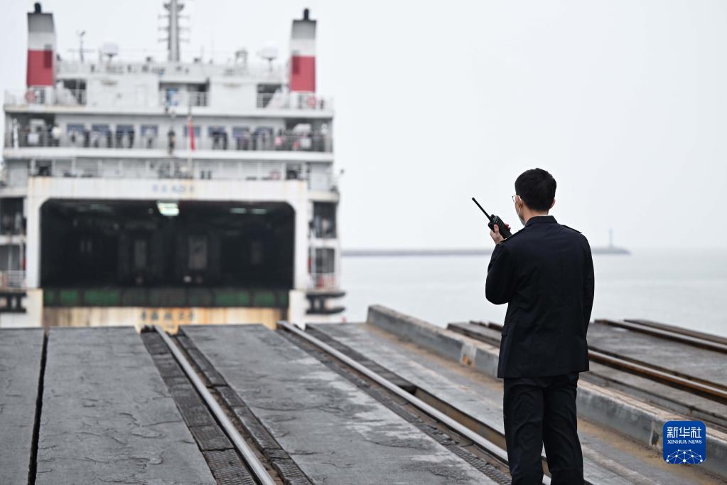 在广东徐闻的粤海铁路轮渡北港码头的火车栈桥上,熊美周用对讲机和同事通话(1月8日摄)。