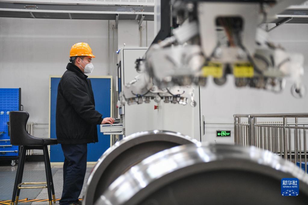 1月12日,在包头车辆段检修车间轮轴检修间,工作人员操作设备对轮轴进行超声波探伤。