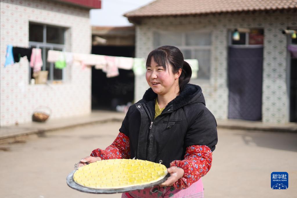 1月11日,元古堆村的村民端着面饼准备制作烤馍。