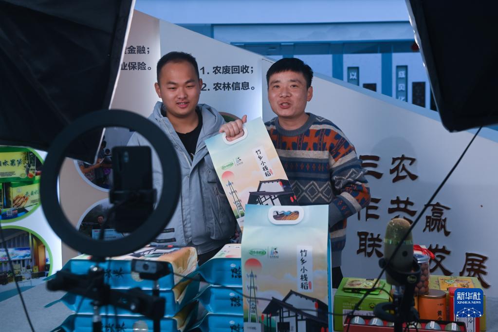 1月13日,在太湖源镇党群服务中心的直播间,吴旭东(右)和创业伙伴吴斌一起吆喝自己种植的大米。