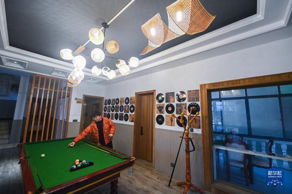 1月13日,在浙江省杭州市临安区太湖源镇横徐村,吕康在自己开办的民宿里整理台球桌。