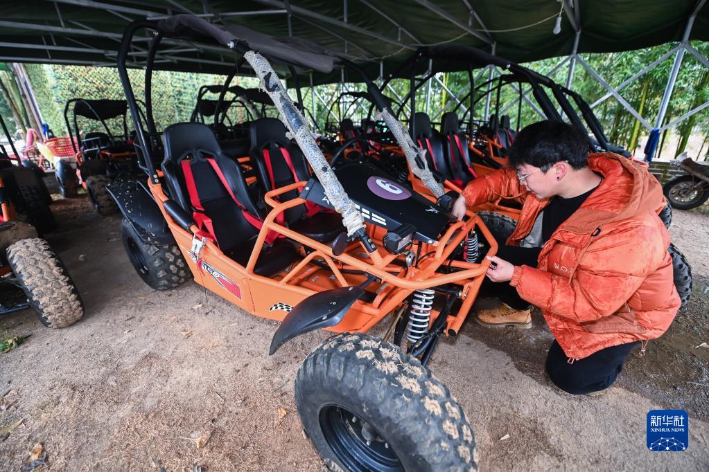 1月13日,在浙江省杭州市临安区太湖源镇横徐村,吕康在检查民宿里供游客体验的越野车。