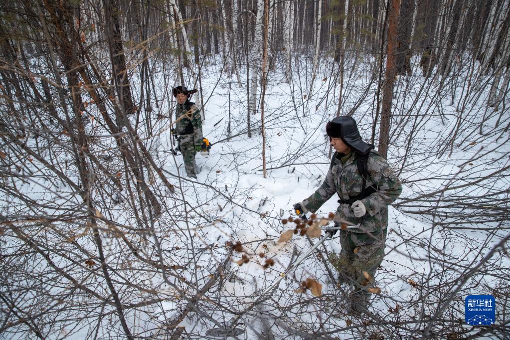1月11日,在漠河林场管护区作业点,割灌机手韩万富(左)和张国林在进行林间清理作业。