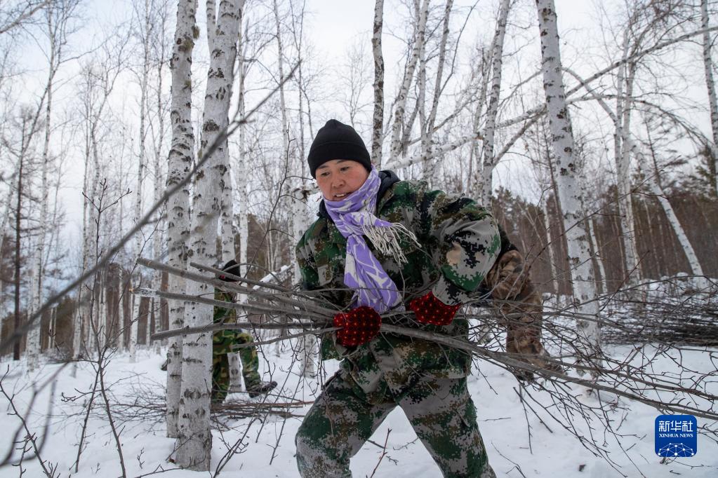 1月11日,在漠河林场管护区作业点,森林抚育工人闫秀艳在进行林间清理作业。